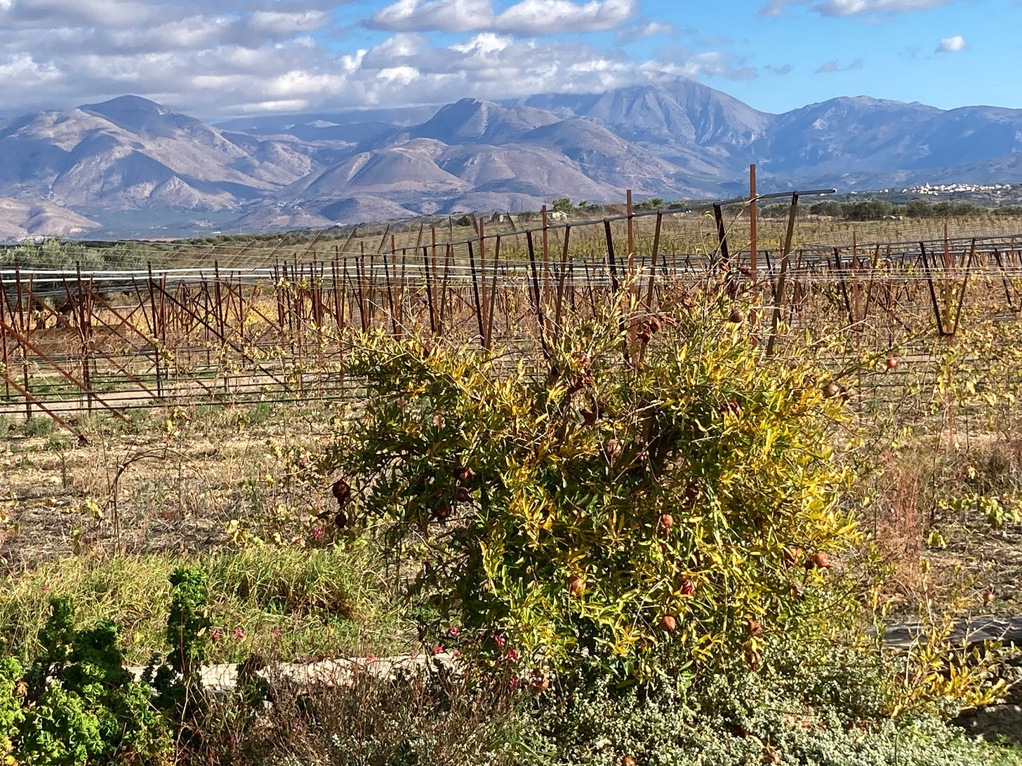 And so, on another day, we find ourselves on a trip to another epicurean delight: a wine tasting at a vineyard up in the mountains. We wind, on the bus, through picturesque winter vistas, snow dusting some of the peaks. Off the bus, we follow a road out of a village, passing ragged gardens with pomegranate trees and a farmer’s field with end-of-season tomatoes and peppers, some of which have been hoiked out by the root and left by the roadside. The vineyard prides itself on cultivating a range of grapes traditional to Crete but abandoned and recently reintroduced; and after a brief introduction to all that by the friendly manager, we sit and begin our tasting. Outside, so that we have a view of the mountains, but ironically in the shade rather than the sun, because being in the sun would also entail being in a wind tunnel.